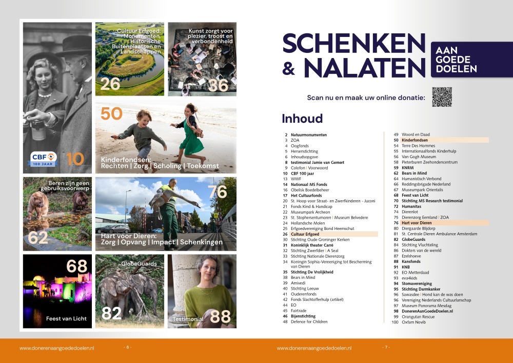In dit magazine wordt uitgebreid aandacht besteed aan wat de goede doelen in Nederland of in het buitenland met uw donatie kunnen betekenen voor de maatschappij. In het magazine kunt u een breed overzicht van goede doelen, fondsen en stichtingen waaraan particulieren en bedrijven kunnen doneren terugvinden. De inhoud varieert van redactionele stukken met uitleg over diverse goede doelen en adviezen op dit vakgebied, daarnaast staan er advertenties in met betrekking tot schenken en nalaten aan goede doelen. Ook komen mensen aan het woord die hebben gekozen om (een deel van) hun vermogen en bezittingen aan een goed doel na te laten. Zij vertellen waarom ze er voor gekozen hebben om hun erfenis na te laten aan een goed doel en welke betekenis het voor hen heeft.