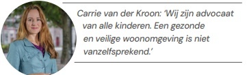 Defence for Children Nederland komt op voor de rechten van alle kinderen, met extra aandacht voor kinderen in de kwetsbaarste situaties. Carrie van der Kroon is Manager Communicatie, Public Affairs & de Kinderrechtenhelpdesk. De organisatie is gevestigd in een oud weeshuis in Leiden. Hier verbleven vroeger kinderen die ook in de textielindustrie van Leiden hebben gewerkt. Vroeger was dit geen fijne plek voor de kinderen. Vanuit dat weeshuis komt de organisatie nu op voor de rechten van kinderen door het geven van gratis juridisch advies in individuele zaken, maar ook door te werken aan structurele oplossingen, bijvoorbeeld door onderzoek, voorlichting en het geven van advies aan de overheid betere wetgeving en beleid voor kinderen. ‘Wij zijn advocaat van alle kinderen, al 41 jaar. Via onze Kinderrechtenhelpdesk bieden we gratis juridisch advies aan kinderen, ouders, advocaten en hulpverleners in zaken waarin kinderrechten in het geding zijn. Want ook in Nederland ervaren veel kinderen onrecht en een gebrek aan hulp. Zo zijn er duizenden kinderen in Nederland dak- of thuisloos, moeten kinderen lang wachten op mentale zorg en komen steeds meer kinderen thuis te zitten na een conflict met school of doordat de juiste ondersteuning voor een kind op school niet geboden kan worden. En dat in het rijke Nederland.’ Ze spreekt moeders met baby’s die op straat zijn beland of in een auto of een caravan slapen. Ze lopen vast in het systeem en komen van het ene in het andere probleem terecht. ‘Een gezonde en veilige woonomgeving is niet vanzelfsprekend. Wij zien ook problemen met de kwaliteit van woningen, zoals schimmel, die blijvende gezondheidsschade veroorzaken.’ Ze noemt ook het niet-gegarandeerde recht op water bij het afsluiten van voorzieningen kwalijk. ‘Wij hebben een rechtszaak gevoerd tegen de staat en waterbedrijven en die gewonnen maar we horen alsnog dat gezinnen met kinderen afgesloten worden van het water. Wat betekenen kinderrechten dan?’ Er is, kortom, ook in Nederland veel urgentie. ‘Omdat kinderen zichzelf niet kunnen verdedigen tegen onrecht, doen wij het.’