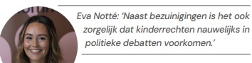 Eva Notté: ‘De afgelopen jaren zijn erg pittig geweest voor organisaties zoals die van ons. Wereldwijd zien we een trend waarbij kinderen en ontwikkelingshulp niet langer als een prioriteit worden gezien en dit voel je ook terug in de beschikbare gelden, bijvoorbeeld vanuit de Verenigde Staten, Europa maar ook vanuit Nederland waar eerst een groter budget beschikbaar was. Programma’s die al jarenlang draaiden dreigen nu af te lopen omdat er geen financiering meer is. In sommige gevallen was dit zo abrupt dat bestaande programma’s niet eens konden worden afgemaakt. Naast bezuinigingen is het ook zorgelijk dat kinderrechten nauwelijks in politieke debatten voorkomen. We zien daardoor dat kinderen geen prioriteit zijn op de politieke agenda. Dat vinden wij zorgelijk, kinderen zijn juist de toekomst!.’ De stichting Internationale Kinderhulp werkt vooral in het buitenland en heeft in sommige landen te maken met corruptie en oorlog. ‘In het buitenland hebben we soms met politieke instabiliteit te maken. Daardoor zijn we zelfs gestopt met onze projecten daar. In Congo zetten we juist door. Daar woedt een burgeroorlog. We hebben geluk dat ons project op een eilandje ligt.’ Defence for Children signaleert dat de belangen en rechten vaak vergeten worden. Carrie van der Kroon: ‘In Nederland zijn er veel wisselingen in de politiek, die de continuïteit van beleid belemmert. Wij zijn de continue factor waar het om kinderen gaat en brengen daarom de situaties van onrecht en kinderrechten steeds weer onder de aandacht. We overleggen daartoe vaak met rijksoverheid en gemeenten. ’ Het werken aan kinderrechten vergt een lange adem en kost soms jaren. Een voorbeeld: ‘We kregen veel klachten op onze helpdesk van kinderen die bij een kinderbeschermingsmaatregel tot uithuisplaatsing niet alleen van ouders, maar ook van elkaar werden gescheiden, in bijna 50% werden broers en zussen van elkaar gescheiden. De gescheiden uithuisplaatsing geschiedt om praktische redenen en met grote negatieve gevolgen voor de band tussen broers en zussen. Gezinnen zijn een belangrijke basis voor een goede jeugd. Kinderen moeten zoveel mogelijk bij elkaar blijven. Wij zijn in gesprek gegaan met het ministerie van justitie en de Tweede Kamer. Een wetswijziging is toegezegd en het is nu wachten op de nieuwe minister om het daadwerkelijk uit te voeren.’ Stichting Woord en Daad wil een stem geven aan mensen die wereldwijd niet gehoord worden. ‘Het beleid van Nederland of de EU kan contraproductief zijn zonder dat de politiek dat ziet. We vragen aandacht om beleid dat het welzijn van mensen in de weg staat aan te passen. Dat kan gaan om import van grondstoffen met een dubieuze herkomst, maar ook klimaatverandering en duurzame internationale handel. In Afrikaanse goudmijnen werken bijvoorbeeld vaak kinderen. Onze samenleving en regelgeving heeft impact op de meest kwetsbaren in landen die het minder hebben. Dat geeft verantwoordelijkheid.’’ Op dit thema is ook Terres des Hommes heel actief. Eva Notté: Producten die wij dagelijks gebruiken en steeds meer gaan gebruiken worden ook vaak gemaakt met grondstoffen die gewonnen worden door kinderarbeid. Er is financiering nodig om dit op de politieke agenda te houden.’